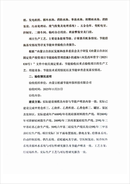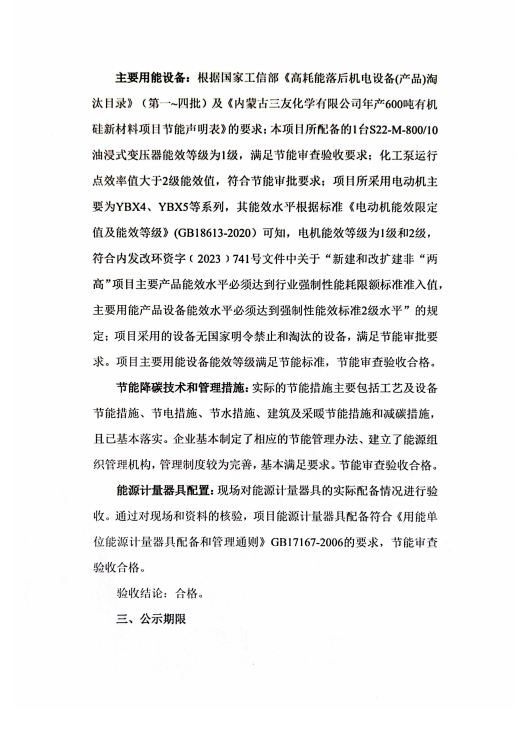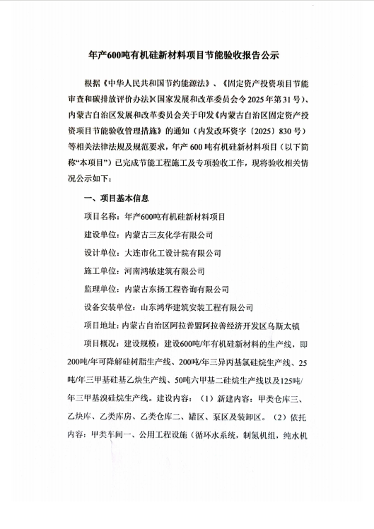 内蒙古三友化学有限公司年产600吨有机硅新材科项自节能验收报告公示